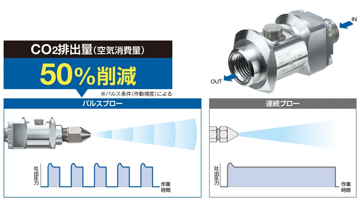 - 繰り返し衝突する断続的なエアブローにより、連続ブロー比 除去効率35%向上(※当社試験による)