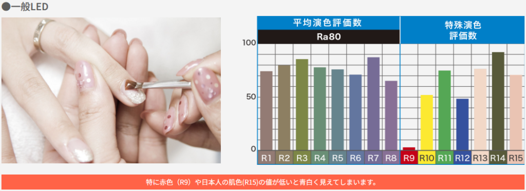 忠実な色味の再現性を必要とする色評価用光源にはRaだけでなく、R9~R15などの特殊演色評価数も高い性能が要求されます。エコリカでは青色LEDでは再現が難しい赤(R9)や日本人の肌色(R15)などキーとなる色味においてAAA蛍光ランプ以上の再現性を実現しております。