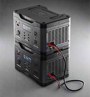 別販売品の並列接続ケーブルで2台のポータブル電源を接続し同時に稼働させれば、出力電源と電池容量をアップさせられます。